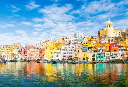 Navštívíte místo, kde se ve středověkém přístavu Coricella zastavil čas. Různobarevné domky jsou vedle sebe naskládány jako krabičky od sirek, mezi nimi se proplétají uzounké uličky se starými kostely a nad touto scenérií se tyčí středověká pevnost na skále Terra Murata. Plným právem získala Procida status pro rok 2022: “Hlavní místo italské kultury”.
